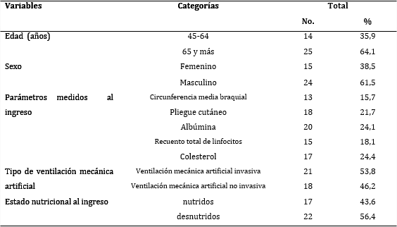 En la tabla 1 se observa un predominio del sexo masculino (24 para 61,5 %) y las edades comprendidas entre 65 y más años (25 para 64,1 %), para ambos sexos. Los valores medidos al momentos del ingreso para determinar el estado nutricional de los pacientes mostraron hipoalbuminemia (20 para 24,1 %), seguida del pliegue cutáneo (18 para 21,7 %) y de la hipocolesterolemia (17 para 20,4 %). También, se halló una primacía de la desnutrición al ingreso con 22 pacientes (56,4 %), de los cuales 21 (53,8 %) necesitaron VAMI.