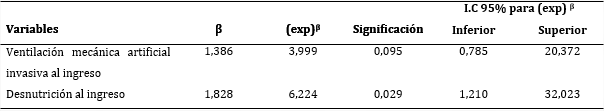 El modelo de regresión logística obtenido para la identificación del poder predictivo de las variables independientes seleccionadas (estado nutricional al ingreso y la presencia de ventilación artificial mecánica invasiva) en la evolución desfavorable de los pacientes proporcionó un elevado porcentaje de clasificación correcta global (76,9 %) y estimó que la desnutrición al ingreso se erige como factor causal significativo (p= 0,029) de evolución desfavorable en la población de individuos expuestos a este riesgo [OR= 6,22; I.C 95 %: 1,21; 32,02], es decir, existió 522 % de riesgo de desenlace desfavorable en estos afectados, quienes presentaban desnutrición al ingreso en relación con la cohorte de aquellos que mostraban buena nutrición (tabla 2).