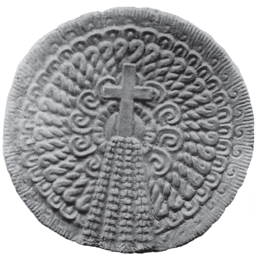 A Peñafiel le llamó la atención el disco con la cruz, así que fue una de las piezas que escogió fotografiar. Se refirió a ella en unas líneas del texto, señaló que la decoración que acompañaba a la cruz era de “estilo antiguo” y, para explicar la presencia de este disco de la cruz al lado de moldes y piezas con motivos que él juzgaba prehispánicos, escribió: “Esta unión de lo antiguo clásico y de lo colonial, se explica fácilmente, si los descendientes del alfarero antiguo alcanzaron la época de los conquistadores.”31