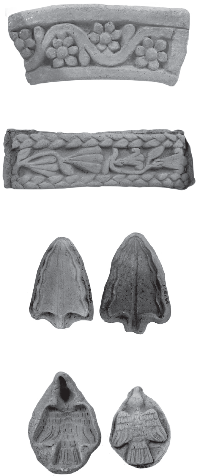 También hay, entre las piezas y moldes de la colección, algunas formas mucho más naturalistas, afines a las que se aprecian en grabados del siglo XVI, y a las que se usaron en viñetas de obras como la de fray Diego Durán (1537-1588)38 o fray Bernardino de Sahagún (1499-1590)39 y también en la decoración conventual. Tal es el caso de una cenefa curva con una sucesión de flores ligadas a un tallo ondulante (fig. 7a);40 el molde para una cenefa recta con otro tipo de flores, como capullos de madreselvas o freesias (fig. 7b);41 el molde para una hoja de lirio (fig. 7c);42 o bien moldes con la figura de un pájaro (fig. 7d).43