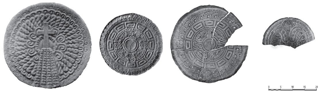 La sensación de disparidad de la colección empieza a disiparse cuando se descubre la repetición de figuras y la conexión existente entre distintas piezas y moldes, con diversas combinaciones que comparten motivos entre sí. Esto confirma la idea de la contemporaneidad del conjunto y, más aún, la de su probable pertenencia a un mismo programa decorativo que incluiría algunos símbolos de origen antiguo, desprovistos de cualquier alusión que se pudiera considerar directamente idolátrica, y otros temas nuevos. Las placas con forma de trapecio, por ejemplo, exhiben motivos, como flores y plumas, que aparecen en varios moldes sueltos de la colección. Como en este momento aún trabajo en el análisis comparativo de todo el conjunto, me quiero limitar a la presentación de cuatro piezas (fig. 8): el disco del que ya he hablado y otros tres, relacionados con éste. En realidad, dos de ellos son piezas acabadas para cuya elaboración se utilizó un molde y las otras dos son moldes para realizar sendos discos. Las llamaré disco de la cruz latina (fig. 1),44disco de los cuatro remates de plumas (fig. 9a),45molde de las cuatro volutas (fig. 10)46 y molde de la mazorca de maíz(fig. 11).47