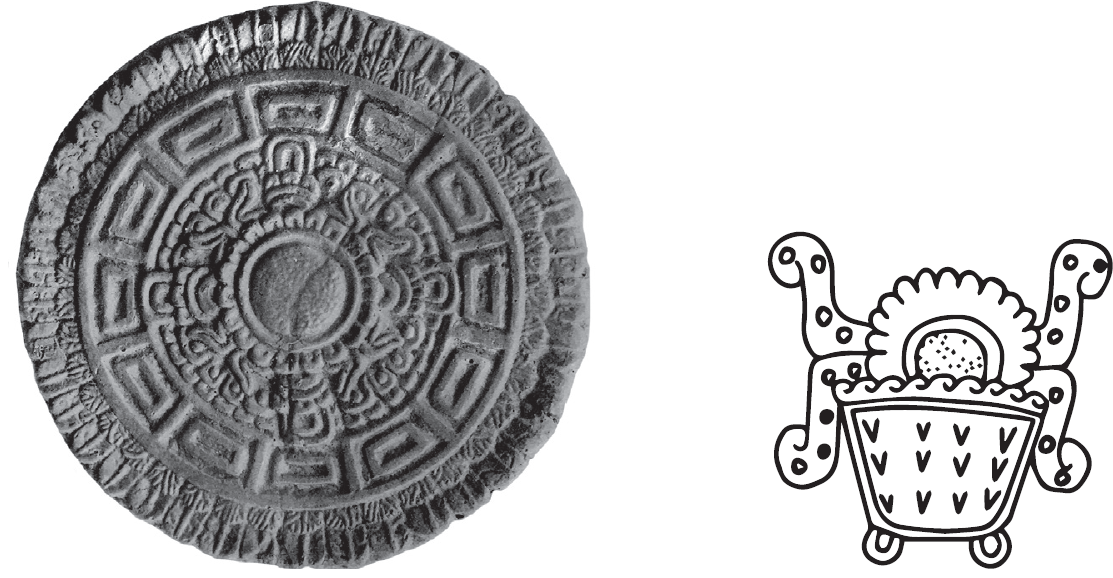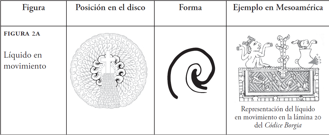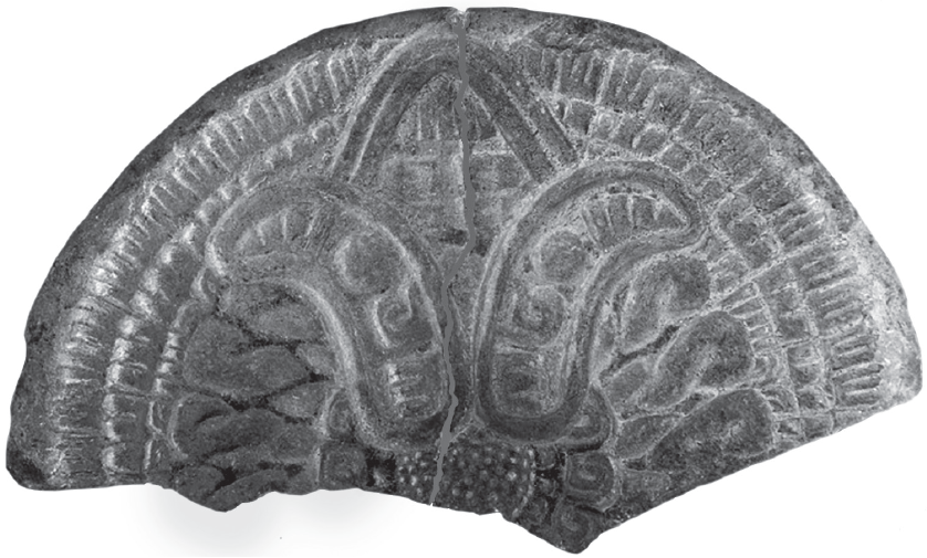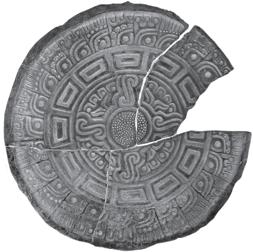 Por su parte, el disco de los cuatro remates de plumas y el molde de las cuatro volutas, que no tienen las ondulaciones de presunto líquido ni el torzal, comparten dos rasgos muy notables. Uno de ellos son los cuatro brotes de vírgulas que se bifurcan, reminiscentes aunque no idénticas a las representaciones pictográficas prehispánicas del humo que surge de las ofrendas en proceso de quemarse (fig. 9b).49 Y el otro rasgo en común entre los dos es una cenefa circular con una sucesión de doce trapecios.