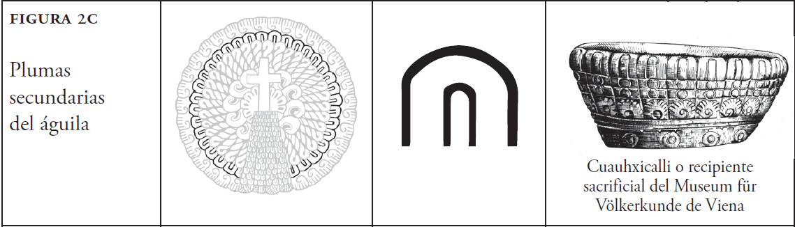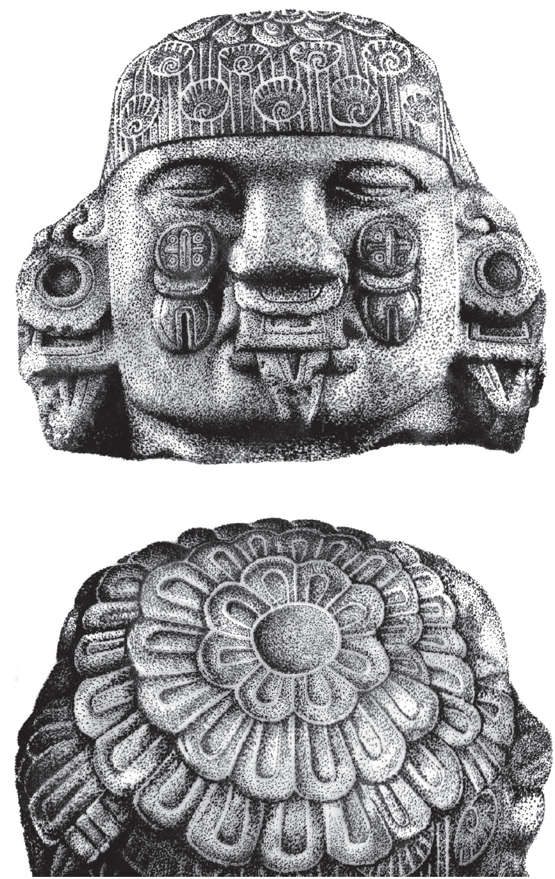 Dos conjuntos de diseños forman la decoración del disco: uno se despliega en forma radial a partir del centro y otro asciende verticalmente desde la base hacia el punto central y se le superpone. En general, los diseños circulares coinciden con motivos de la tradición mesoamericana aunque no se encuentra una combinación idéntica en ninguna obra prehispánica. En el núcleo se advierte la representación de una flor cuyo centro es grande como el capítulo de un girasol, en contraste con sus pétalos cortos. Si observamos los diseños que rodean la flor y se suceden hacia el exterior del círculo podemos ver un motivo de ganchos reiterados, como ondas que se encrestan, que coincide con representaciones mesoamericanas de líquido en movimiento (fig. 2a).6 Luego vemos una progresión de bandas que se doblan sobre sí mismas formando torzales. El torzal aparece con alguna frecuencia en imágenes cosmográficas mesoamericanas y representa las rutas o conductos de naturaleza opuesta que permitían descender a las fuerzas celestes y ascender a las fuerzas del inframundo (fig. 2b).7 Las dos últimas franjas están formadas por motivos plumarios: el primero es la representación esquemática del extremo de las plumas secundarias del águila, anchas y redondeadas, usual en ornamentos y piezas ceremoniales indígenas (fig. 2c).8 Y la orla propiamente dicha está formada por un diseño convencional que conocemos como plumón de sacrificio, una abstracción pictográfica9 que representa cada uno de los puñados de pequeñas plumas de garza que se pegaban en el cuerpo de las víctimas sacrificiales, así como en las banderas y escudos usados en el ritual (fig. 2d). La combinación del despliegue de las plumas de punta redondeada y los plumones de sacrificio ocurre en la escultura mexica de la cabeza de Coyolxauhqui; en ese caso, además, la sucesión de tres redondeles de plumas y el diseño de un círculo en el centro da lugar a la forma de una flor (fig. 3).10