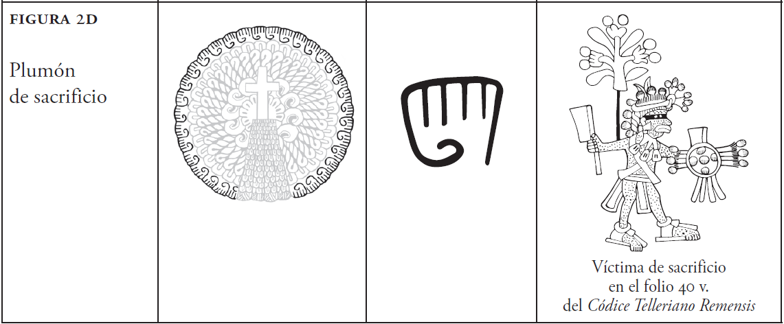Dos de los discos (un positivo y un molde) tienen como hemos visto la sucesión de crestas ondulantes alrededor de la flor, que parecerían reforzar el simbolismo de la sangre que brota de la “flor” abierta. Los otros dos discos muestran, en cambio, las volutas de humo propias de la ofrenda que se quema.61 Esta ofrenda que se consume, para que pierda su materia pesada, se volatilice y pueda ser absorbida por los dioses, en la tradición mesoamericana, es en muchos casos una bola de zacate o papel impregnada de la sangre de un ave o de un sacerdote, también puede ser un corazón o la sangre de una víctima sacrificial. Así pues, en los cuatro discos se alude a la sucesión del hecho sacrificial: en dos de ellos por la sangre que fluye, en los otros dos por el humo que la eleva.