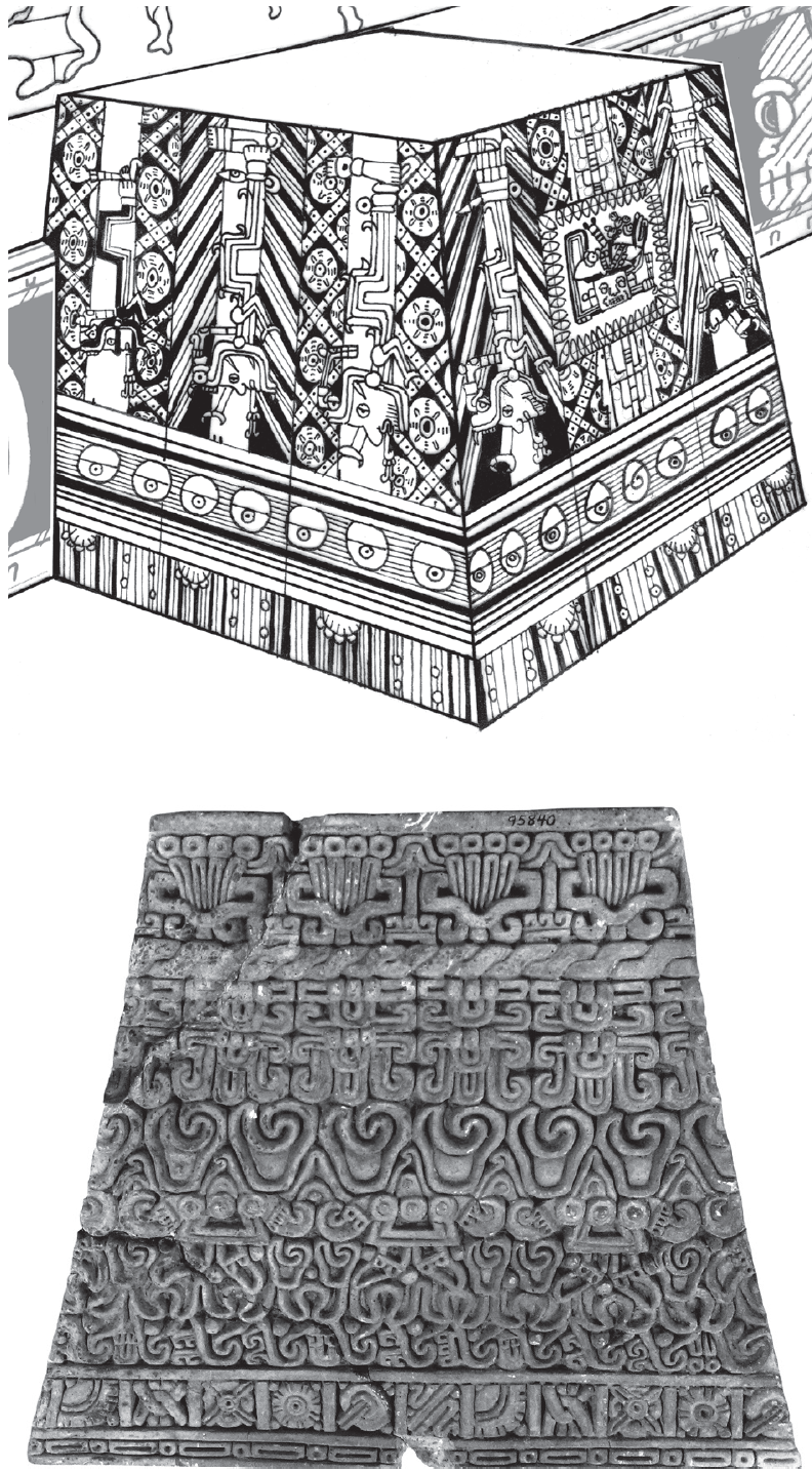La presencia de símbolos reconocibles en el repertorio prehispánico, pero en una composición que no identificamos en obras y fuentes antiguas, ocurre en algunas obras del siglo XVI, como el convento de Malinalco, antes citado. Que estos trapecios no son vestigios de una etapa anterior del taller cerámico sino obras contemporáneas a las demás, puede deducirse de la afinidad en el material y la técnica con el resto del conjunto. Además, varias de las formas representadas en los trapecios existen sueltas, como moldes o como formas en positivo, en el mismo grupo: es el caso del monte, algunas figuras de las plumas, así como las cuentas del borde inferior. La forma de trapecio de ambas placas resulta tan curiosa para la tradición occidental como es familiar a la cultura ceremonial del Posclásico mesoamericano: se trata de la forma que típicamente adoptaban los altares, sobre los cuales se colocaban las ofrendas. Hay representaciones pictóricas como, por ejemplo, en el tonalámatl del Borgia,37 y algunas obras de mampostería aún conservadas, como la del templo de Ocotelulco, Tlaxcala (fig. 4a).