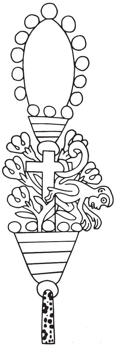 También en la Psalmodia aparecen metáforas asociadas al valor de las cuentas. La gracia del cristiano se compara con brazaletes y collares de jade que fueron dejados por los doce apóstoles al partir.67 También se incluye en un canto la figura de que la ciudad de Dios brilla como una estera de brazaletes y se dice que hay doce piedras preciosas en sus muros con los nombres de los doce apóstoles.68 Es posible, entonces, que el círculo de doce trapecios esté relacionado con el sacrificio y la gracia y que tenga un sentido apostólico.