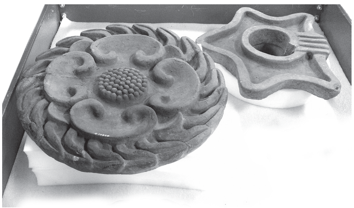 La gran mayoría de las piezas son planas y carecen de vista tanto en sus cantos como en su reverso. Esto indica que se trata de piezas hechas para ser miradas sólo de frente. Y puesto que no tienen punto de apoyo alguno, lo más probable es que hayan sido concebidas para fijarse con mezcla en un muro. Al menos tres de ellas (fig. 6)33 tienen una suerte de anillo prominente en el reverso; parece tratarse de decoración para frisos, a la manera de los clavos escultóricos de círculos o flores que solían decorar los palacios y los templos en la época prehispánica y también en el siglo XVI.34 El resto de las piezas no muestra este tipo de recurso para la incrustación, por lo que parece haber sido pensado para pegarse más que para empotrarse.