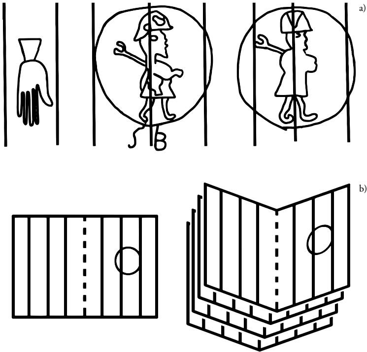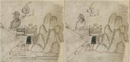 A second intervention took place on Lafragua 11r, which had a different purpose. Rather than being purely decorative, the objective of this repaint was to obscure information. In figure 7 the current state and a partial reconstruction of the original are given. As can be seen, the original calendar glyph of the seated figure was Deer. While Jansen and Pérez Jiménez suggest that this may have been 4 Deer, there is no reason to assume that the numeral was altered.27 Perhaps here too the chemical characterization of the inks could provide the answer. As mentioned by Doesburg and colleagues, the black section in the entrance to the temple/palace below was also created during the later intervention by the editor, possibly to cover up something underneath.28 This means that the interpretation of this place as Tilantongo or “Black Town” is somewhat problematic.29