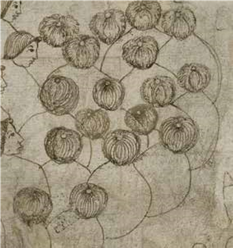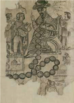 Although the genre of the codex remains unclear, its pictographic contents show several similarities with contemporaneous documents produced by indigenous communities to prove abuse perpetrated by Spanish authorities. Codex Tepetlaoztoc, or Codex Kingsborough (1553), from a town in the north of the State of Mexico, for example, details the complaints against the exploitative and violent behavior of the encomendero and other Spanish officials.51 The longest part of the document deals with the excessive tribute that was requested annually. In a manner similar to Codex Yanhuitlan, large quantities of raw material (grains or gold) are represented in a rather simplified and concise manner, while precious items are depicted in a large format with a specific attention given to details. Folio 216r (fig. 15) depicts a golden necklace, whose beads show the same pre-Hispanic motifs, such as volutes, found in the rosary necklace in Codex Yanhuitlan (Lafragua 8r-8v, fig. 11); only this time the central piece is represented by a flower with nine bells. In the same page, there are also several golden disks, a depiction found on AGN 505r in the case of Codex Yanhuitlan. Obsidian mirrors are found on Codex Tepetlaoztoc, folios 224v and 225r and Codex Yanhuitlan, AGN 507r. Large feather works in the form of fans are seen on folios 226v and 227 of Codex Tepetlaoztoc and CCSD 3v and AGN 505v of Codex Yanhuitlan.