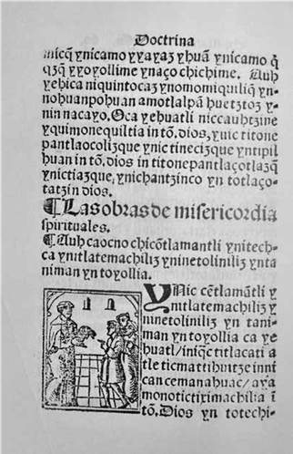 A stylistic analysis of Codex Yanhuitlan reveals the close connection of the main author (or tlacuilo) of the manuscript with the art schools founded by the Franciscans in Mexico-Tenochtitlan the newly established capital of New Spain. An illustration (fig. 9) from the Liber Sacerdotalis printed in Venice in two editions in 1523 and 1534 shows clearly that European printed books were a stylistic and iconographic referent for one of the artists of Codex Yanhuitlan, particularly in the fashioning of the tonsured heads, which bear a close resemblance to the heads in Lafragua 5r (fig. 10). Bishop Juan de Zumárraga owned a copy of the Liber Sacerdotalis and a few surviving illustrations from the earliest book printed and illustrated in the New World, the Manual de adultos (National Library, Madrid), printed by Juan Pablos in Mexico City in 1540, which bear a close resemblance to the Italian antecedent.33 Another illustration taken from an early book printed in the workshop of Juan Pablos clarifies the identification of the central figure of Lafragua 8v (fig. 11), which has been a matter of disagreement among scholars. The man, who wears a long robe and large hat, with a knotted rope on the cap, has been interpreted as a religious figure, such as a vicar or bishop.34 More recently, Jansen and Pérez Jiménez and Doesburg and colleagues believed it to be a lay character.35Figure 12, an illustration that first appeared in the 1553 Doctrina by Pedro de Gante, depicts one of the seven spiritual works of mercy: instructing the ignorant. A man on the left is engaged in a lively conversation with a group of smaller men on the right. The works of mercy involve lay people, and not friars or priests, in the caring for the material and spiritual wellbeing of those in need. The people offering the works are often depicted wearing a long robe that covers the whole body and a large hat, a reference to the first act of mercy attributed to a traveling Samaritan. The scene of the Mexican engraving therefore shows a double relationship with the page from Codex Yanhuitlan, in both form and content. Not only can the central character be identified with a lay person, but it can also be argued that he is in fact engaged in a spiritual work of mercy, because the topic of the animated conversation seems to be the presentation and teaching of the rosary.36 García Valencia and Hermann Lejarazu have noted the complexity of the gestures in Codex Yanhuitlan, which, nonetheless, do not bear much resemblance to the equally complex gesturality of the Mixtec codices.37 Many of the early illustrations produced for Juan Pablos, such as the one depicting the spiritual works of mercy, show the typical rhetorical gestures of Renaissance treatises, an indication that such representational conventions were circulating in New Spain’s artistic, intellectual, and indigenous circles from a very early date.