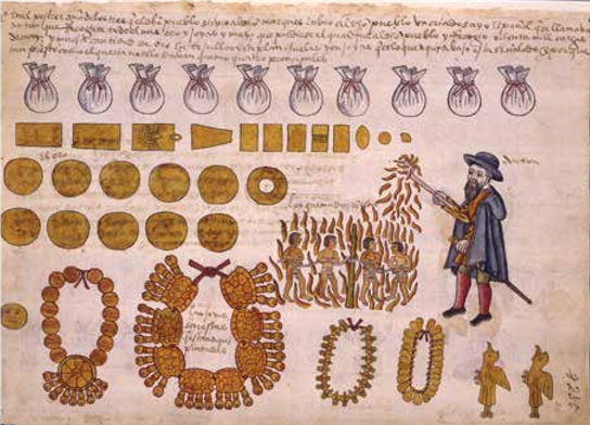 The AGN pages, which were also cut and repurposed in a different late colonial lawsuit, on the other hand, contain depictions of Mesoamerican gods and pre-Hispanic luxury items together with a narrative scene of two male characters. As such, both CCSD and AGN sections contain one page with human figures combined with year glyphs, while the rest depicts items with a clear precolonial iconography, luxury items, such as feather-work and jewelry. In fact, aside from those pages there is little in the document that refers to pre-conquest times. This suggests that at the time when the two parts of Codex Yanhuitlan were separated to accompany a lawsuit, early colonial events therein depicted were recalled as proof of wealth to further claims of antiquity and legitimacy.