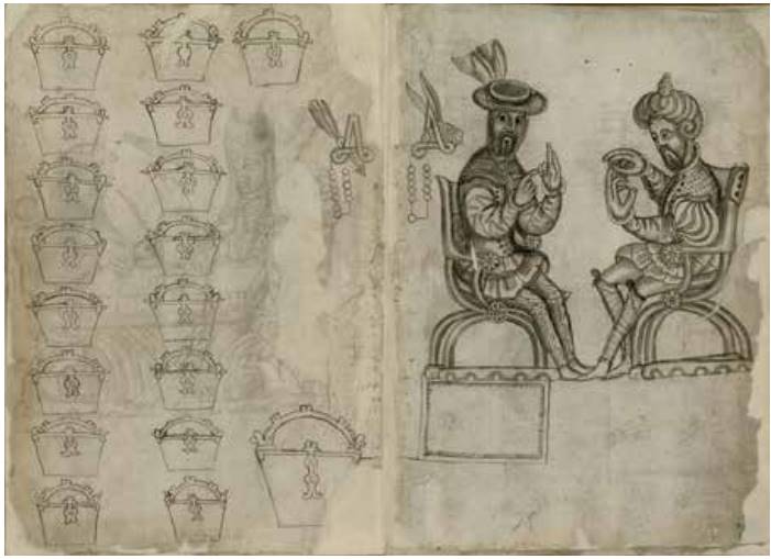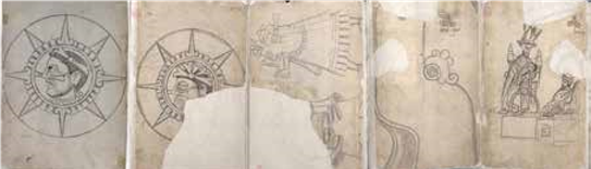 A paper mold often has one watermark, placed off-center. When a single sheet is folded in two (called bifolio) to make a quire the size of Codex Yanhuitlan (ca. 21.6 × 33 cm), one folio presents a watermark, while the other is blank. Stacking a series of such sheets creates a quire in which on one side all pages contain a watermark, while on the other side no watermarks are visible (fig. 1b). In the final book, composed of multiple quires next to one another, one would thus have alternating sections of pages with and without watermarks. Only in the middle of each quire, would there be one whole bifolio, with a watermark on one side. It seems plausible that Codex Yanhuitlan was drafted and preserved in quires, probably sown together to make a single book, until the eighteenth century, when it was reused in a series of lawsuits. All CCSD pages have the same watermark indicating that they not only belong to the same half quire, but were cut from it, a fact that reinforces the hypothesis that the current and complete dismemberment of the manuscript is due to a much later reuse in a seemingly unrelated lawsuit. Contentwise, these pages illustrate -several large and luxury objects (a shield, a feather cape, two trumpets) together with a narrative scene that includes two male -walking characters in the center.