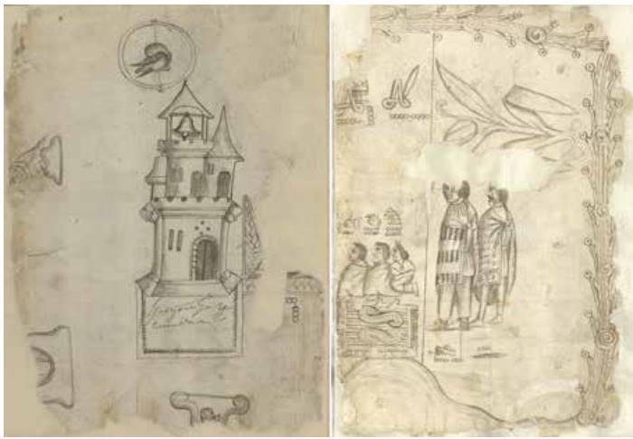 The first part of the codex appears to have undergone the largest intervention after its initial execution.24 Additions can often be visually identified by the presence of an ink of different color than that used to make the drawings of the codex. The color of the later additions is black, where the original ink has now faded to brown. This is a common property of iron-gall inks found in many older manuscripts. The fact that the ink used to make the corrections has remained completely black would suggest however that this is something other than iron-gall ink. Doesburg and colleagues state that the black ink is carbon based, a common precolonial writing material.25 Chemical characterization, which is now possible with a wide range of non-invasive techniques may offer crucial insights on different interventions by distinguishing chemically different but visually similar inks.26 These different inks correspond to what are clearly different hands with different levels of skill. A rather unskilled and unsteady hand made what seem to be purely decorative additions to the existing drawings. These are clearly visible on Lafragua 11r (fig. 6), where flower motifs and other roof decorations, as well as an extension of the staircase, were added to the temple depicted on the left side. Similar decorations were also added to the palace on Lafragua 5r and they seem to be by the same hand as the decoration of shields and one added figure on Lafragua 5v. If so, these decorations all date from a rather late period, as is suggested by the classical seventeenth century Louis XIV style large curled hairdo of the man on the bottom right of Lafragua 5v.
