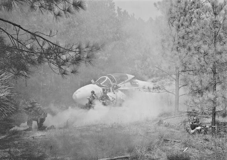 En relación con la otra estrategia significativa de escenificación de situaciones que devienen en imagen, podrían citarse como elementos articuladores de las mismas un juego con la estética de lo real para construir las imágenes sobre lo bélico. La obra de An-My Lê es paradigmática en este sentido. En su serie Small Wars (1999-2002)28 puede comprobarse cómo la formalización de la fotografía se centra en la escala de grises y en la iluminación propia de escenas de exterior que remite, de manera explícita, a las fotografías documentales clásicas, en las que recrea las batallas que tuvieron lugar durante la guerra de Vietnam (Fig. 3). Con una voluntad de conocer la historia en profundidad, tras un largo proceso de investigación, cuida todos los detalles que le permiten recrear un acontecimiento que se confunde con la realidad misma. La serie 29 Palms29 (2003-2004) está compuesta de panorámicas del desierto californiano que recuerdan a las imágenes de guerra de Roger Fenton, recreando también escenas bélicas detalladas con gran minuciosidad. La artista busca una identificación del escenario de guerra con lo real, una coincidencia del simulacro con la realidad, pero se trata de unas imágenes carentes de sangre, asépticas, demasiado generales que nos relatan una lectura más conceptual que real, que -pueden leerse en términos simbólicos. De alguna forma, parece que dentro de la descontextualización está dejando fuera el contenido histórico-político que da origen a la guerra.