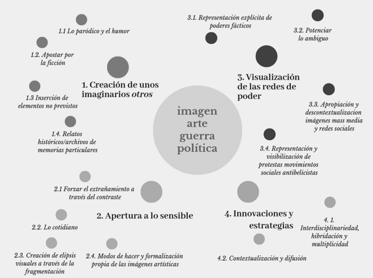Con base en lo expuesto se han considerado una serie de categorías de análisis (Fig. 4) que permitan discutir los resultados obtenidos. Dichas categorías son las siguientes: 1) la creación de imaginarios otros a partir del quiebre de los imaginarios colectivos sobre el tema de estudio; 2) imágenes abiertas a la subjetividad que posibiliten una entrada a lo sensible capaz de activar un pensamiento crítico y emancipador; 3) la visibilización de los modos en los que las redes de poder atraviesan los relatos históricos en torno a conflictos bélicos, y 4) las innovaciones y estrategias significativas detectadas en las obras analizadas y sus conexiones con los modos de hacer de las prácticas artísticas contemporáneas.