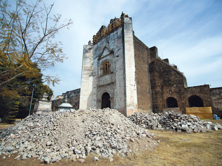 El 19 de septiembre de 2017 un fuerte movimiento telúrico de 7.1 grados en la escala de Richter con epicentro localizado a 12 km al sureste de la localidad de Axochiapan, Morelos, sacudió el centro de la República mexicana.4 El sismo provocó serios daños materiales en 11 entidades: Estado de México, Ciudad de México, Tlaxcala, Puebla, Morelos, Oaxaca, Guerrero, Chiapas, Veracruz y Tabasco (estos tres últimos en menor medida). El censo levantado tras la contingencia rebasa los 2 000 inmuebles de valor patrimonial. En casi un tercio de ellos, la destrucción fue muy severa, presentándose colapsos principalmente en las torres, las bóvedas y las cúpulas de los templos, así como en los cerramientos de los segundos cuerpos de las crujías claustrales del poniente.