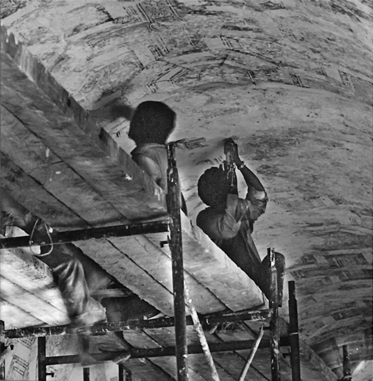 En Tlayacapan la pintura del siglo XVI, que permanecía oculta debajo de sucesivas capas de yeso, se descubrió poco antes de 1960 por trabajadores del pueblo, quienes comenzaron a retirar el recubrimiento raspando la superficie sin la supervisión de especialistas. En marzo de 1960 los trabajos se suspendieron por órdenes del arquitecto José Gorbea Trueba, quien en ese entonces era director de Monumentos Coloniales del Instituto Nacional de Antropología e Historia. Durante estas primeras campañas de “descubrimiento” se develaron también las decoraciones de los muros del templo y de la sacristía, y se repusieron los aplanados que hoy vemos en todos los vanos hacia el claustro, con la finalidad de conferirles protección ante los estragos de la humedad.44 Hacia 1969 el problema de deterioro y la falta de mantenimiento del convento persistía, además se estaban haciendo tareas de demolición en los altares laterales del templo (Fig. 10).45