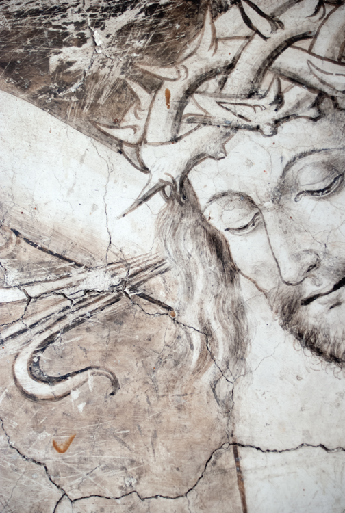 A primera vista, los programas murales de la sala de profundis muestran diferencias en cuanto a la longitud, grosor y ejecución del trazo, así como en la profundidad y poder cubriente del color negro que dibuja las líneas de contorno y los tonos grises que sombrean las formas y rellenan los fondos. Estas variaciones se observan más marcadas en las escenas donde los repintes -realizados durante alguna de las intervenciones del siglo XX- están redibujando por completo a los personajes. Dichos repintes fueron aplicados usando un pincel grueso cargado con una tinta parda que ocultó parcialmente el trazo original, como se observa en la Crucifixión, donde las líneas negras del momento de ejecución poseen transparencia, continuidad y fueron hechas alla prima. Por el contrario, los repintes son líneas pardas y ondulantes de anchos variables (Fig. 11).