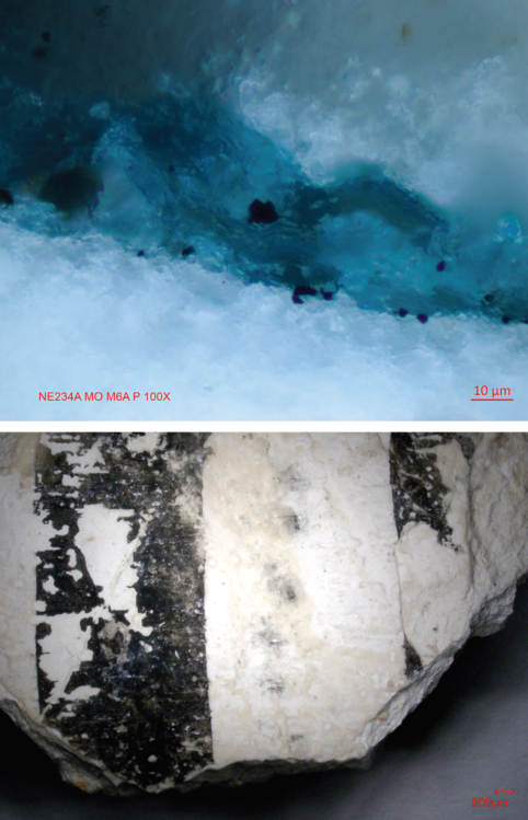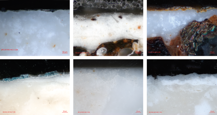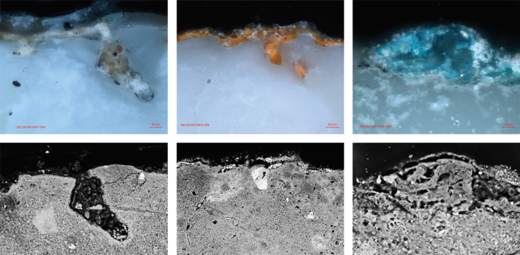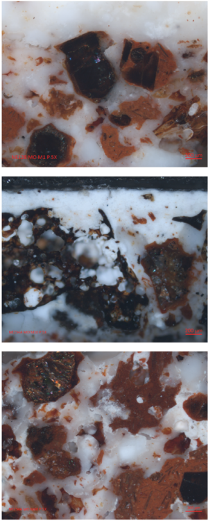 Tanto en la escena de la Crucifixión de la sala de profundis como en el diseño geométrico de los casetones que decoran la bóveda del claustro alto se detectaron huellas de dibujo preparatorio. Los trazos fueron ejecutados mediante estarcido, es decir, depositando finísimas partículas de negro de carbón vegetal a través de una plantilla con agujeros distribuidos a intervalos regulares. Aunque los puntos de pigmento no se conservaron en toda la superficie debido a la aplicación de la pintura y su consiguiente bruñido, fue posible ubicar diversas zonas con estas huellas. Asimismo, en las secciones transversales de las muestras recuperadas se identificaron las partículas negras que conforman el dibujo, pues yacen en estratos intermedios entre los frentes de carbonatación y la matriz de cal de la capa de color (Fig. 15).