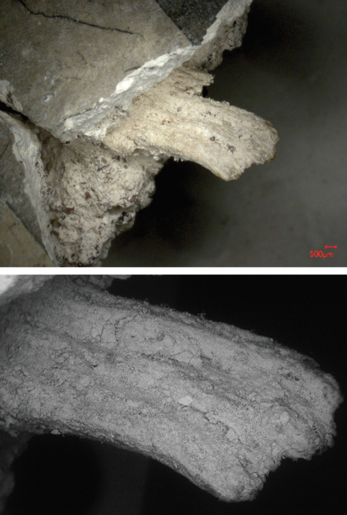 En el conjunto conventual de Tlayacapan, así como en otros monasterios agustinos fundados en el siglo XVI, como los de Atotonilco y Epazoyucan, estudiados previamente, no se practicó la aplicación del enlucido fino por jornadas, éste se extendía en grandes zonas hasta cubrir la totalidad del espacio arquitectónico. Los artífices conseguían mantener el muro lo suficientemente húmedo como para disimular las uniones del enjarre mediante la adición de fibras vegetales y astillas de madera en la mezcla de cal.68 En las muestras del claustro alto de Tlayacapan se han encontrado abundantes astillas de madera agregadas a las pastas de cal cuya función parece tener relación con una vieja práctica ya sugerida en el tratado de Alberti: “para enjarrar un muro en un ambiente caluroso se deben añadir pequeños fragmentos de cuerdas viejas a la mezcla de mortero” 69 (Fig. 14).