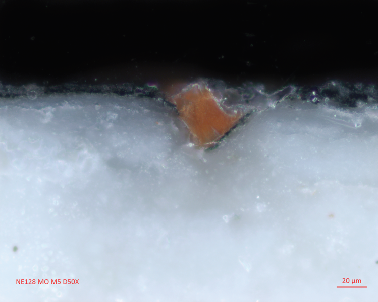 Los artistas que pintaron en la sala de profundis del convento de Tlayacapan tuvieron un cuidado extremo en la aplicación del enlucido para obtener una superficie lisa y bruñida hasta hacerla brillar. Sabemos que también la capa pictórica recibió el acabado bruñido, ya que, en una de las muestras procedentes del delineado de san Juan en el muro oeste, quedó atrapado un gran cristal de tierra anaranjada que presionó la superficie. Esto indica que el enlucido no había perdido por completo su humedad y plasticidad cuando tuvo lugar el bruñido. Como se ve en la microfotografía óptica, el pigmento está encima de la capa de negro de carbón que conforma el delineado (Fig. 16).76