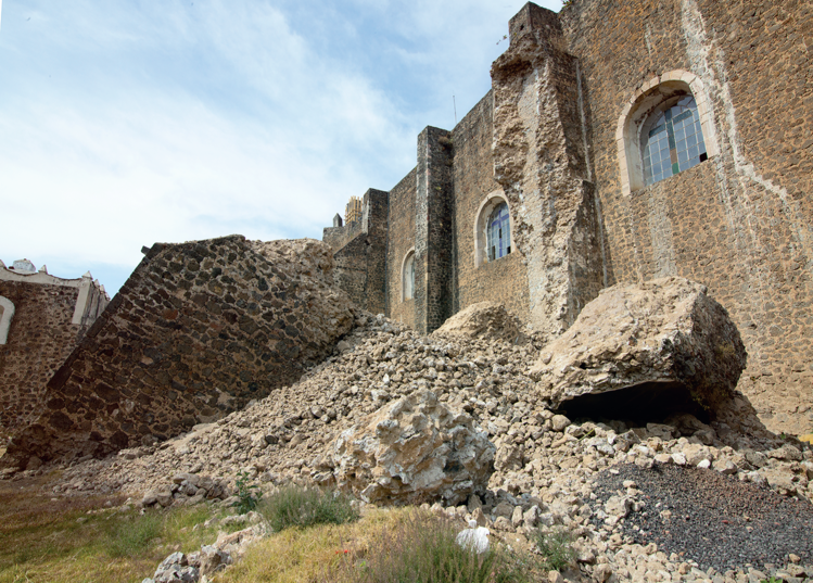 Después del 19 de septiembre de 2017, los templos en la “ruta del volcán” se volvieron espacios donde ya no es posible rezar. La sensación que producen estos enormes conjuntos es cercana a la que se experimenta al estar frente a una ruina, aunque su estado mutilado y fragmentario apela también al reconocimiento de nuestra incapacidad para conservarlos. Como si fueran especímenes biológicos, hoy el método de aproximación a estos edificios ha sido más cercano a la acción de disecar, fascinados por el viaje hacia su composición interna, el principio de su construcción y las huellas de su hechura. Es ahí cuando se desenmascara su verdad: sus materiales, sus principios estructurales, su diseño. Y entonces vemos que es difícil imaginar su estado original o lo que queda de “auténtico” o prístino; el aura del siglo XVI. Las imágenes, más que acompañantes en el recorrido, son conjuntos casi irreconocibles: borrones, golpes y lagunas dispersas en pilastras, paredes y bóvedas. Los fenómenos naturales violentos tienen la capacidad de evidenciar hasta qué punto había comenzado la ruina de un edificio antes de la catástrofe y también exhiben las fallas en las acciones de reconstrucción del pasado. Como bien lo ha dicho Gionata Rizzi, entre más se reconstruye un edificio, más alejado queda de su autenticidad.82