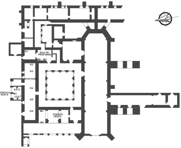 Al analizar el plano de conjunto de Tlayacapan es posible distinguir correspondencias entre el espesor de los muros de las dependencias anexas al claustro, mismas que fueron levantadas durante las etapas iniciales del proyecto edilicio. Las habitaciones necesarias para el desarrollo de la vida conventual fueron las primeras en ser consideradas. La organización del espacio, de raíces medievales, experimentó cambios en el tamaño de las dependencias durante las diferentes etapas constructivas, pero éstos siguieron la lógica de favorecer el cumplimiento de la vida comunal según se establecía en la regla.20 Alrededor del claustro se ubicó un corredor que comunicaba con la sala capitular, el refectorio, la cocina, la sacristía y el portal de peregrinos.21 La capilla abierta debió ser parte del primer proyecto constructivo pues su estructura quedó integrada en la conformación del claustro definiendo la anchura de las crujías. Está conectada con una pequeña anteportería por donde se accedía al interior del claustro (Fig. 4).