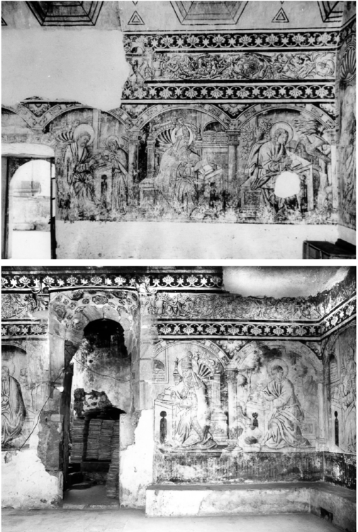 El programa mural de la sala de profundis es la suma de diversas etapas pictóricas. Tras la observación in situ, el análisis de las fotografías históricas y el registro científico de las imágenes mediante radiaciones ultravioleta e infrarroja fue posible identificar los cambios y las huellas de las intervenciones. El suelo de esta sala se encuentra en un nivel más bajo que el del refectorio y del claustro. Colinda en su lado sur con la escalinata de acceso al segundo piso, debajo de la cual se forma una especie de bodega estrecha. Actualmente, la sala tiene dos accesos, uno hacia el claustro y otro hacia el refectorio en su lado norte, aunque no siempre fue así. Creemos que el primer cambio debió ocurrir en el mismo siglo XVI, cuando se construyó la planta alta del convento, y con ella se trazó y erigió la escalinata, para lo cual fue abierto el vano en el muro sur de la sala de profundis.31 El segundo cambio habría sido la modificación de la puerta en el muro norte, a mediados del siglo XVIII y después de que se cediera el convento al clero secular, momento en que la ocupación del conjunto ya no hacía necesario contar con una sala de profundis. Los últimos cambios sucedieron en el siglo XX, tras el descubrimiento de los murales. Por fotografías históricas sabemos que desde la década de 1960 había una puerta angosta que conducía hacia las huertas. Hoy vemos en ese lugar una ventana abocinada (Fig. 5).