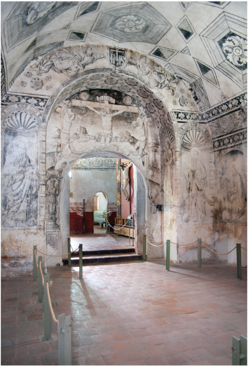 No sabemos cuál fue el criterio que siguieron los trabajadores locales para eliminar algunas pastas de enyesado y dejar otras. Por ejemplo, en la bóveda del claustro, bajo los plementos que se forman al interior de las nervaduras se realizó un desencalado parcial, dejando al descubierto sólo las cenefas perimetrales. Es posible que la decoración del siglo XVI permanezca aún al centro de los triángulos. Otra zona con problemas de “historicidad” en su lectura iconográfica es la sacristía, pues mientras se liberó la pintura que decora la bóveda, también fue conservado un friso decimonónico. Este espacio se ha convertido en una especie de catálogo confuso de formas y soluciones pictóricas de todas las épocas de ocupación del edificio.