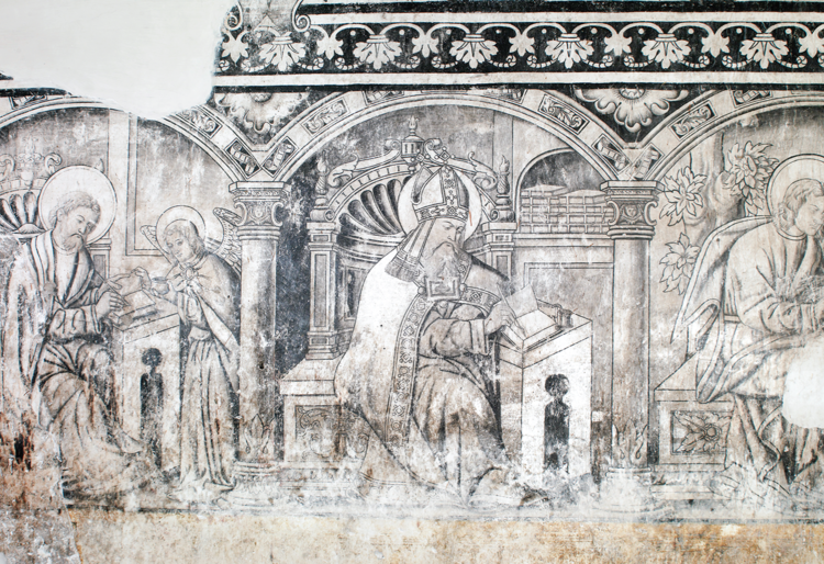 En los muros laterales vemos la sucesión de figuras alternando un evangelista y un doctor de la Iglesia del rito latino. Así, el lado este inicia con san Marcos y san Gregorio Magno, seguido por san Lucas y san Ambrosio de Milán, que se ubica ya en el muro sur. En el muro oeste vemos a san Juan, san Agustín de Hipona y san Mateo. Al tomar en cuenta esta disposición, el personaje ausente sería san Jerónimo de Estridón.32 Esta figura podría haber estado en el muro sur, flanqueando por el lado derecho la Asunción de la Virgen, de la misma manera que lo hace san Ambrosio en el extremo contrario.33