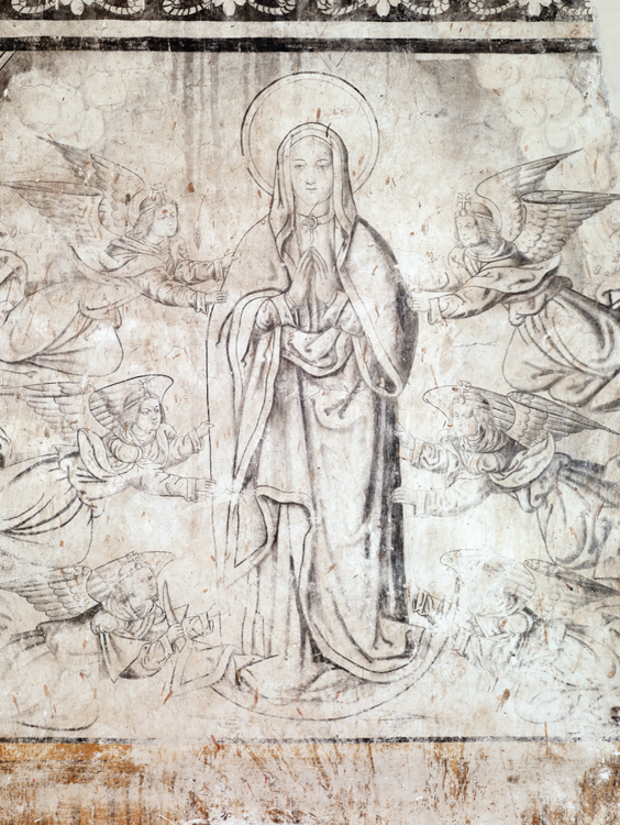 En el muro sur se observa como imagen central la Asunción de la Virgen. El dogma de la asunción corporal de María fue aceptado oficialmente en el siglo XX, en la encíclica del papa Pío XII Munificentissimus Deus. El documento recogió las preocupaciones que durante siglos habían sido debatidas por teólogos. Este pasaje de la vida de la Virgen no fue sancionado por los libros canónicos, permaneció como una leyenda atribuida a san Juan Damasceno y fue compilada por Santiago de la Vorágine en su Leyenda dorada.38 En el arte español del siglo XVI era usual que la Assumptio corporis se mezclara con el tema de la Inmaculada, al menos después del pequeño retablo que hiciera Michael Sittow como obra de devoción para la reina Isabel.39 Así ocurre en Tlayacapan, donde vemos a María de pie, con las manos unidas al pecho en actitud de oración; se desplanta sobre una luna creciente con los cuernos hacia arriba. La diferencia con la obra de Sittow es que aquí no se lleva a cabo la Coronación. Estamos más bien en el momento del ascenso, por ello, el querubín a los pies de María apenas asoma un fragmento de su rostro. Como se sintetiza en la encíclica de Pío XII,40 la elevación de María es un hecho que se lleva a cabo fuera o a pesar de las fuerzas de la naturaleza, por lo que requiere la participación divina. En este caso, son tres ángeles a cada lado y un querubín, apenas distinguible, bajo la luna quienes la ayudan a elevarse a los cielos. El fondo que enmarca el milagro lo constituye un conjunto de nubes ascendentes (Fig. 9).