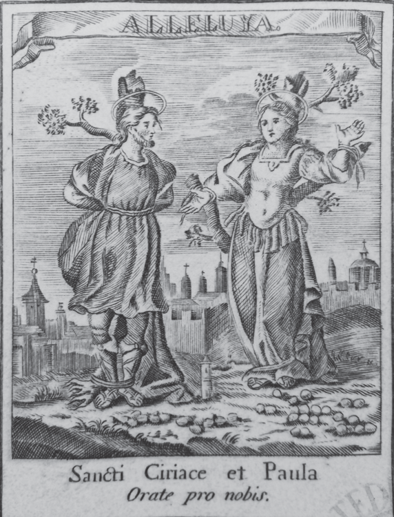 Las representaciones de san Ciriaco y santa Paula53 eran hasta la fecha, por su reducido culto local, un fenómeno casi exclusivamente malagueño. De ahí lo excepcional del hallazgo en México de este cuadro novohispano, como primer ejemplo de su difusión más allá del municipio del que son patronos y su provincia. Al igual infrecuente resulta su representación por un artista extranjero fuera del ámbito malagueño. Tan sólo existirían unas mínimas referencias previas ilustradas en algunos de los citados martirologios, pero son imágenes genéricas de un martirio por lapidación que en ningún caso hacen referencia a la tradición local como aquí es el caso.
