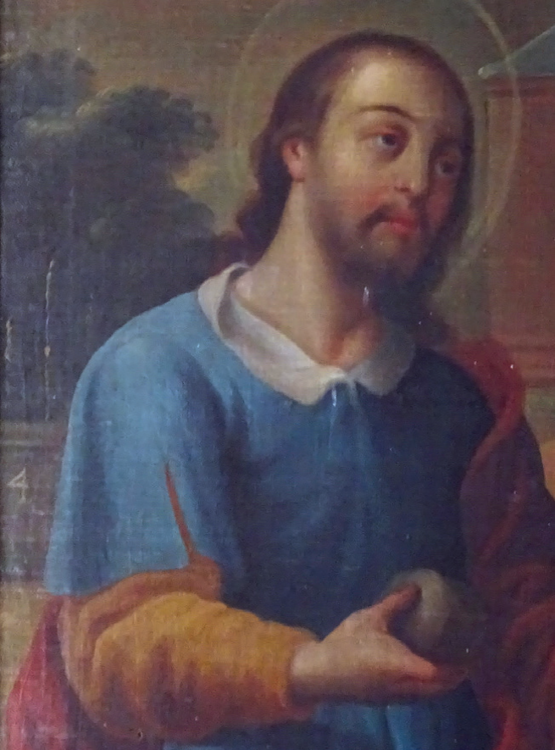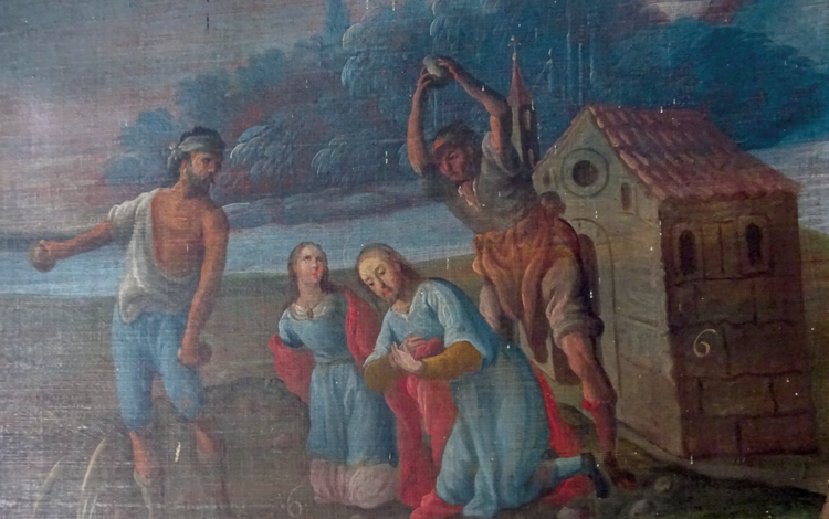 En esta ocasión, y siendo consecuente con la representación principal de los santos en el cuadro, Pedro López Calderón tampoco dispone a los mártires atados a ningún árbol, apartándose del modelo malagueño para presentar una lapidación al uso.83 Con ello se ajusta a lo descrito por algunas fuentes, que refieren a estos santos como imitadores en su martirio a san Esteban; protomártir al que se suele representar, precisamente, como en este lienzo.84
