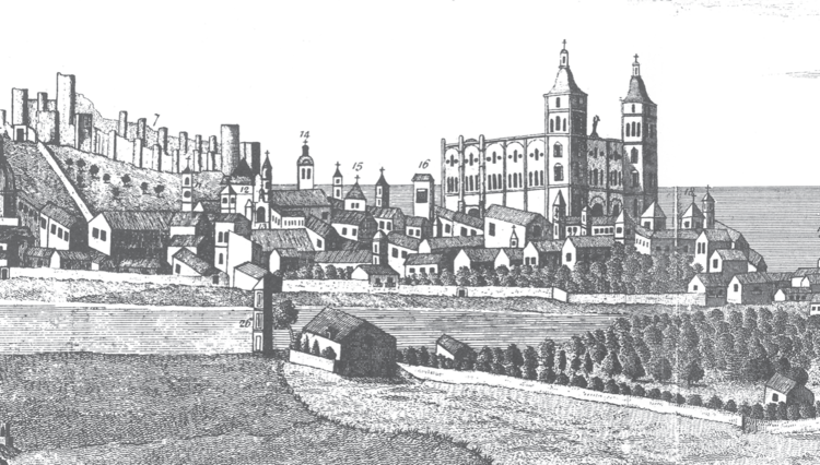 La primera referencia numerada que recoge la cartela es a la muralla de la ciudad. No es un elemento tan relevante en la leyenda de Ciriaco y Paula, salvo por el hecho de que su lapidación suela ubicarse fuera de su recinto. La ciudad de Málaga, por su carácter costero, contó con una importante dotación defensiva que se remonta a las primeras murallas fenicias, ampliadas en época romana y sobre todo durante los siglos de dominio musulmán.70 Su trazado final fue de perfil almendrado, circunvalando la ciudad, y a lo largo del mismo se sucedían distintas torres, con un aspecto que dista mucho de la muralla cuadrada y de lienzos corridos que recrea López Calderón.