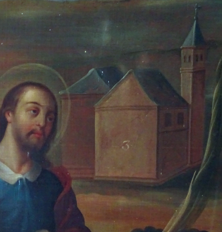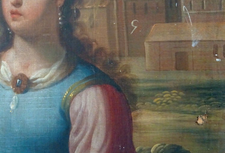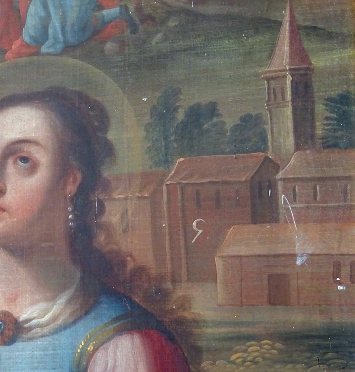 Por último, me detengo en su buen estado de conservación, que permite descartar un posible culto público de la obra en su origen y optar por el de una residencia u oratorio particular. Ello explicaría que aunque su barniz presente cierto oscurecimiento propio del paso del tiempo, su superficie no esté ennegrecida por el humo de las velas como ocurre en muchos otros de los cuadros de época virreinal localizados en este mismo templo. Como tampoco muestra las importantes disgregaciones de capa pictórica que suelen ser habituales en la parte baja de las pinturas cuando se encuentran expuestas al calor de las candelas o a la excesiva humedad.