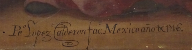 Tras su nombre y apellidos, el pintor incluye en su autografía el colofón “fact. Mexico” (lo hacía en México), en una incongruente combinación del pretérito imperfecto latino faciebat con el castellano México, en lugar de continuar con el latín Mexici, que en cualquier caso no altera su significado. Al optar por esta locución latina, el autor pretendía mostrar su obra como algo imperfecto o inacabado, aportando un matiz de significado que lo diferencia de otros colofones concebidos en tiempos perfectos, como Pinxit Mexici (pintado en México) o el más habitual Fecit Mexici (hecho en México). Todos ellos, en sus formas completas o abreviadas, fueron un elemento característico de la pintura de la Nueva España en el siglo XVIII. Sobre todo entre los pintores más aventajados y con identidad propia, como refuerzo que expresaba, junto a la firma, su carácter creador.