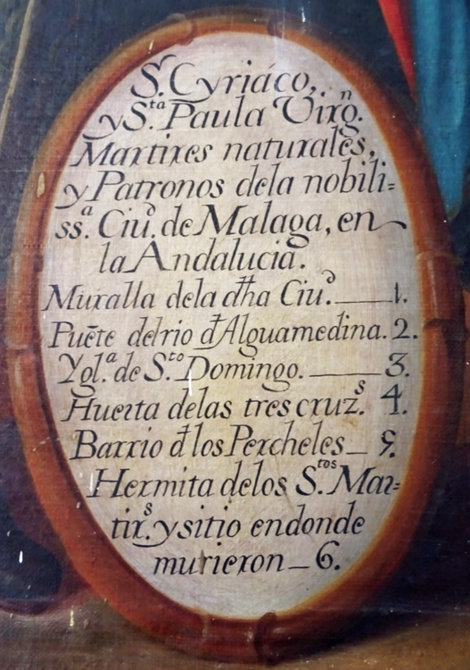 Tras presentar a los santos textual y gráficamente como patronos de la ciudad, analizaré la obra con base en lo recogido en la cartela -como hasta ahora-, atendiendo en este caso a los últimos detalles de su encabezado, que según recordamos cita: “San Ciriaco y santa Paula Virgen, mártires naturales y patronos de la nobilísima ciudad de Málaga, en la Andalucía.”. La referencia a la “nobilísima” ciudad de Málaga responde al título de “muy noble” que le fue concedido ya en 1492 y que aun hoy se suma a otros en su lema.67 La alusión a la región de España de la que forma parte queda justificada por la posibilidad de que su ubicación no fuese conocida entre el público novohispano que contemplara la pieza. Y además, evita posibles confusiones con cualquiera de las 18 otras localidades menores que llevan el nombre de esta ciudad por distintas regiones del mundo, incluyendo varias en territorios estadounidenses antes novohispanos, y una aún en el estado mexicano de Durango.68