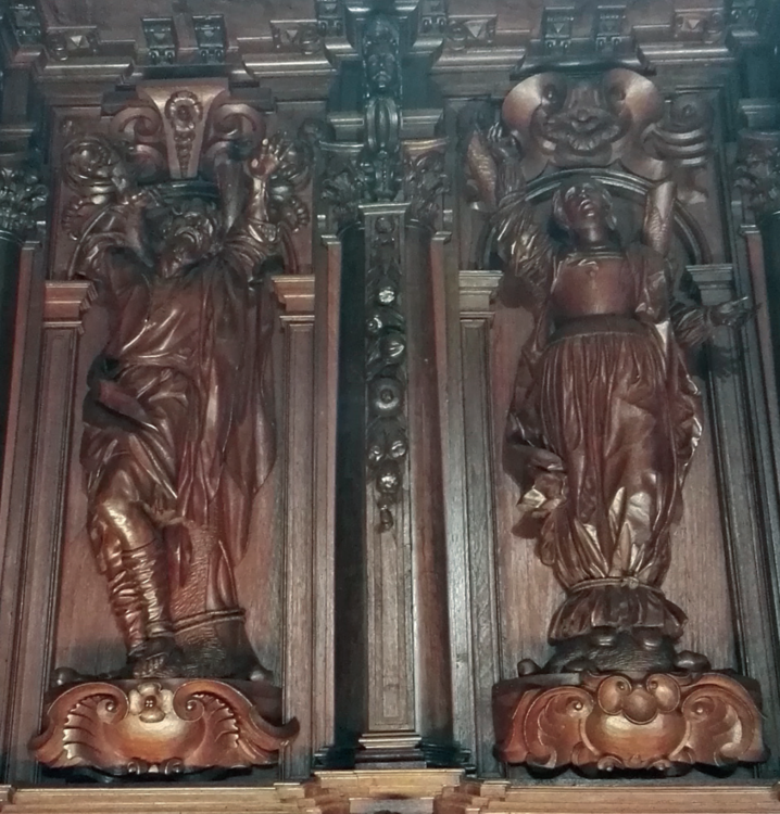 Aunque el patrimonio sacro malagueño ha sufrido numerosísimas pérdidas debidas a diferentes acontecimientos históricos de la Edad Contemporánea, lo conocido a través de fuentes históricas y lo conservado permite afirmar que las representaciones pictóricas de estos santos mártires son, por lo general, más escasas y de menor calidad que las escultóricas. Así, sólo es posible señalar las tablas que Francisco de Ledesma y Jacome de Lobeo pintaron para el Retablo de Santa Bárbara de la catedral de Málaga en 1524 como ejemplos con una calidad equiparable a la obra que ahora descubrimos y analizamos.54 En el mismo templo, otros dos lienzos anónimos se incorporaron en 1637 como agradecimiento a su protección ante una epidemia sufrida, pero su calidad y estado de conservación son muy deficientes.55 En el campo escultórico, mientras tanto, se encuentran creaciones de la talla de los altorrelieves de Pedro de Mena para la sillería del coro de la catedral de Málaga (ca. 1660)56 (Fig. 7) o los medallones marmóreos del portugués Clemente Annes (1730) para las portadas laterales de la fachada principal de dicho templo,57 donde también se les esculpe sobre las cornisas del presbiterio en el siglo XVI58 y en la capilla de la Encarnación (Juan de Salazar, 1783).59 Junto a estas representaciones, destacan también otros cuatro grandes relieves anónimos ubicados en el crucero de la parroquia de los Santos Mártires (1770-1777), donde también se encontraban una pareja de esculturas de bulto redondo presidiendo la capilla mayor desde el siglo XVII. Estas últimas, destruidas en 1931, se sustituyeron por las que Jerónimo Gómez tallara y policromara para el tabernáculo catedralicio entre 1677 y 1688.60 Además, se sumarían las arriba citadas creaciones en plata y diversas manifestaciones en las artes decorativas y gráficas, así como otros relieves pétreos de corte más popular y menor relevancia distribuidos por el paisaje urbano malagueño.61