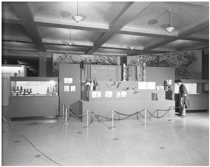 Al buscar mayor información sobre "Across the Pacific" -que contribuyó a afianzar la obra comparativa de Covarrubias-11me encontré con el desalentador panorama de que no existía un catálogo ni una discusión sobre la muestra, tan sólo algunos recortes de prensa. Finalmente pude acercarme a un registro fotográfico de la exposición (Fig. 1).12 Esas imágenes me permitieron vislumbrar el proyecto museográfico de Gordon Eckholm, e intuir la participación de Covarrubias y su presencia en el museo. Al mirar las fotografías de la entrada a dicha exposición, pude darme cuenta de que tras las mamparas introductorias asomaban los mapas realizados por Covarrubias con la ayuda de Antonio Ruiz (1892-1964)13 para la Feria Internacional de San Francisco en 1939. Este detalle es importante en la medida que reafirma, desde otra perspectiva, su relación con el museo. Si el museo hubiera comprado los mapas, éstos habrían estado en exhibición, cerca de la sala que Franz Boas dedicó a las culturas indígenas de la Columbia Británica; pero esta posibilidad no se concretó debido a la exigencia de Covarrubias de que al adquirir los mapas el museo debía comprometerse a exhibirlos permanentemente.14