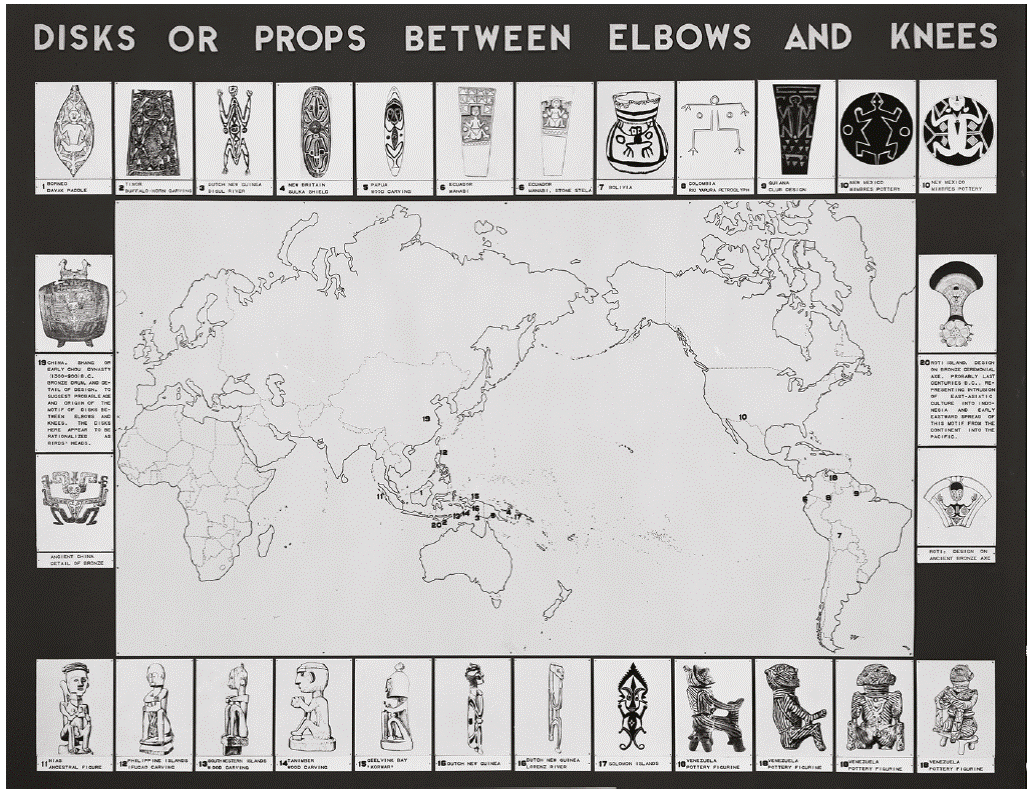 La imagen perteneciente a Carl Schuster, que tuve la oportunidad de rescatar en los archivos del American Museum of Natural History, es un mapa cultural (Fig.4). En medio del mapa puede apreciarse el mapamundi rodeado de una ancha banda dividida en cuadros donde se van acomodando, por medio de dibujos de objetos, los motivos de diferentes culturas en los cuales hay seme janzas: Borneo, Timor, la Nueva Guinea holandesa, Nueva Bretaña, Papúa, Ecuador, Bolivia, Nuevo México, Colombia. En el lado izquierdo encontramos a China y abajo las islas del Pacífico y Venezuela. Por algunas comparaciones que Schuster pone en su mapa, queda claro que la metodología comparativa de Covarrubias, que se observa en algunos motivos incluidos en El águila, el jaguar y la serpiente, coincide con la de Schuster.