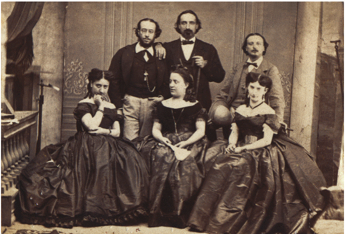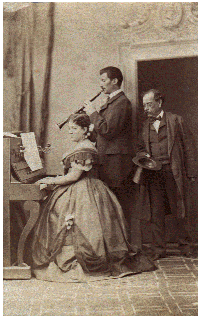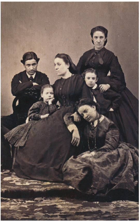 En la colección fotográfica reunida por el escritor Carlos Monsiváis, destaca un singular retrato anónimo, en el que Ángela aparece con su familia: su madre Josefa Castera está sentada en medio de la composición como el eje del matriarcado; a su alrededor se encuentran sus hijos Ángela, Manuel y Elena, además de otra niña no identificada; la madre sostiene el brazo a su querida Ángela que, sentada en el piso, recarga su cuerpo y rostro sobre su regazo; en ausencia de la figura paterna, su abuela, atrás, enmarca la escena (Fig. 13). Quizás, esta fotografía corresponda a su llegada, ya sin el padre que se había regresado a España con la otra familia que había formado.101 En abril de 1866, Ángela Peralta se casó con su primo hermano Eugenio Castera (Fig. 14); a falta de la presencia de su progenitor, que había fungido como su representante, ahora su esposo se encargó de sus futuros proyectos empresariales, entre ellos, montar su propia compañía de ópera.