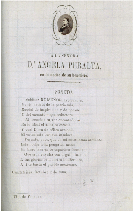 Para el 2 de octubre se había planeado la función de beneficio para la soprano; en aquella ocasión, "al abrirse el escenario, apareció la Sra. Peralta, siéndole luego presentado por el distinguido maestro Sr. Luna, un diploma a nombre de la sociedad jalisciense de 'Bellas Artes', igualmente que una banda formada por los colores nacionales".96 En esta "función de gracia" sus admiradores le arrojaron diversos poemas, ilustrados con su fotografía, utilizando una imagen realizada por el tapatío Octaviano de la Mora, que circuló con gran éxito comercial a partir de septiembre de 1866 (Fig. 9).
