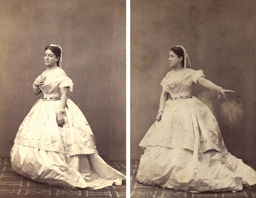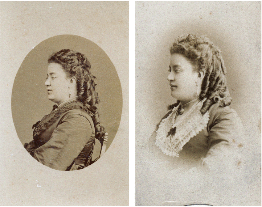 Otros retratos importantes que circularon de Ángela Peralta se realizaron en el estudio de Valleto y Cía., en el que posó completamente de perfil, postura parecida a la fotografía editada por Julio Michaud (Figs. 12a y b).