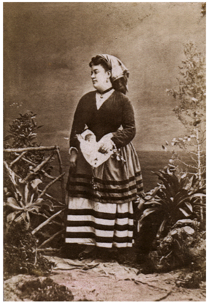 El 29 de enero de 1866, en el Teatro Imperial, se realizó una función de beneficio52 de la cantante. La aparición de la soprano en el escenario se dio en medio de una "luz eléctrica con que en aquel instante se iluminó la escena", en esa ocasión ella portaba "un traje que ostentaba los colores de la bandera nacional".53 De la soprano, existe una fotografía de Francisco Casanova, tomada años después, que pudiera tratarse del registro de Ángela Peralta como la protagonista de La sonámbula; en ella, la cantante posó de frente recogiendo flores, portando un delantal blanco y una pañoleta sobre su cabeza; al parecer ostenta la vestimenta tricolor que reseñan las crónicas; seguramente, Ángela Peralta quiso dejar testimonio de aquel atuendo con el que se consagró ante el público mexicano (Fig. 3).
