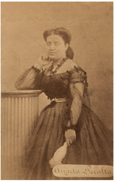 De este periodo inicial en Milán, Italia, existen al menos tres fotografías de Ángela Peralta, tomadas en esa ciudad por Giovanni Battista Ganzini, probablemente entre 1864 y 1865, cuando su estudio se ubicaba en la Via dell' Unione, 4. En una de esas imágenes, la soprano aparece tocando el piano, acompañada por un flautista, ambos de perfil; la representación en el estudio se complementa con la presencia del maestro Agustín Balderas quien, sosteniendo un sombrero de copa y posando a manera "de llegar" a la escena, parece aprobar lo que escucha de sus alumnos (Fig. I). En los otros dos retratos individuales, Ángela posa en personaje, se muestra gesticulando ante la cámara; probablemente, se trate de la representación de Lucía Ashton, del drama trágico Lucía de Lammermoor, ya que porta el característico vestido blanco de la protagonista; las poses pueden aludir a los desvaríos de la dama que enloquece de amor (Figs. 2a y b). Estos retratos debieron realizarse para que circularan y se conociera a la novel cantante, entre un sector de empresarios, compositores, críticos y colegas, y con seguridad estuvieron a la venta a todo el público italiano, fervientes seguidores del arte de la ópera.20