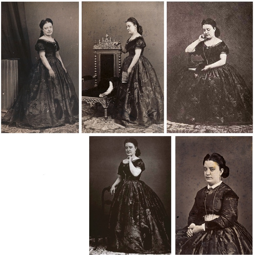 Después de su regreso a México a finales de 1865, la joven cantante asistió al gabinete de Andrés Martínez en la capital del imperio; para ese momento, el establecimiento gozaba de un bien cimentado prestigio tras dedicarse "desde hace muchos años al arte de la fotografía", según afirmaba una crónica publicitaria de su estudio.79 De la Peralta, existen por lo menos cuatro variantes de la misma sesión: en la primera, ella aparece parada cerca de una columna; en otra, cercana a un sillón casi de perfil; también aparece sentada, en actitud de lectura con un libro abierto; en un cuarto retrato, se la ve mirando hacia la cámara esbozando una sonrisa (Figs. 5a-d); finalmente, existe un quinto retrato de Martínez, de medio cuerpo, posando sentada con las manos entrecruzadas, que pudiera haberse tomado en esa misma sesión, aunque con cambio de vestido y cabello recogido atrás (Fig. 5e).
