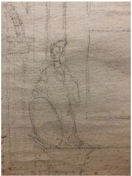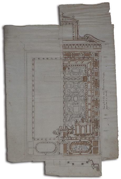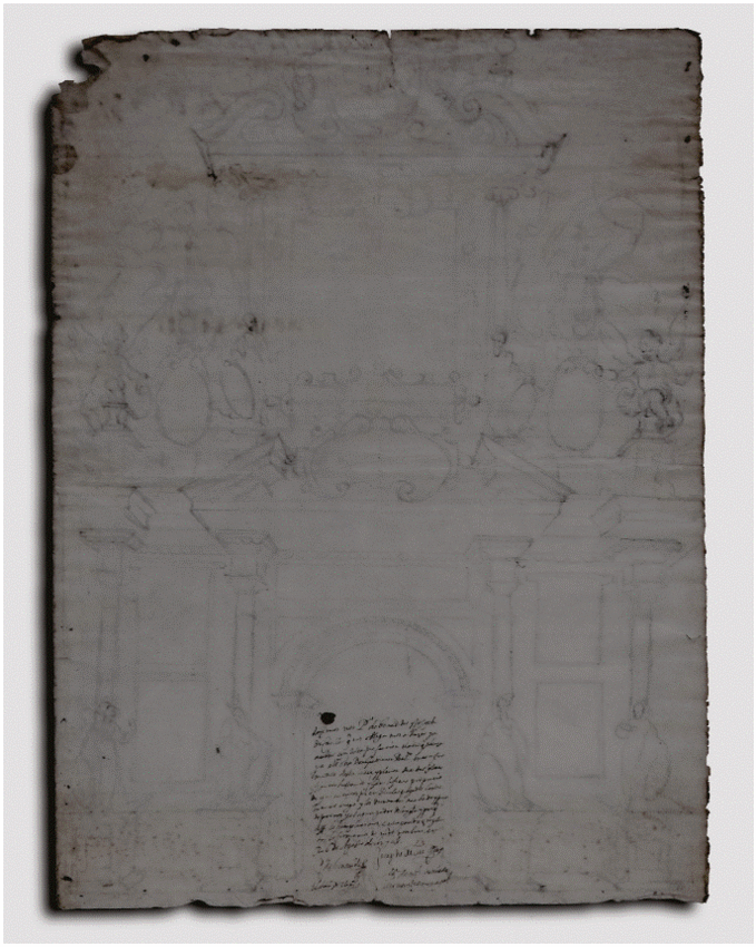 Ayudado de las guías trazadas y de la regla, e insistiendo en las líneas señaladas a las que da mayor presión con el grafito, estableció como referentes la puerta con un arco de medio punto y los laterales. El diseño acordado quedó compuesto por tres calles, dos cuerpos y remate, para los que hilvanó algunas nuevas guías. Las secciones verticales se subdividieron por los plintos tableados y columnas exentas de fuste liso y capitel indefinido, mismas que en algunas zonas se llegan a observar como están trazadas en su totalidad y a las que se superpusieron las diferentes figuras que muestran cartelas ovaladas en las que se pintarían emblemas o textos. Para esto se debieron ejecutar con antelación las divisiones en perspectiva de los cuatro pedestales que marcarán el diseño del cuerpo inferior, del que aún se mantienen múltiples trazos. Se recalcaron aquellos que finalmente formaron parte del diseño y que, por ejemplo, remiten de manera inexorable al aludido Arco de Constantino.