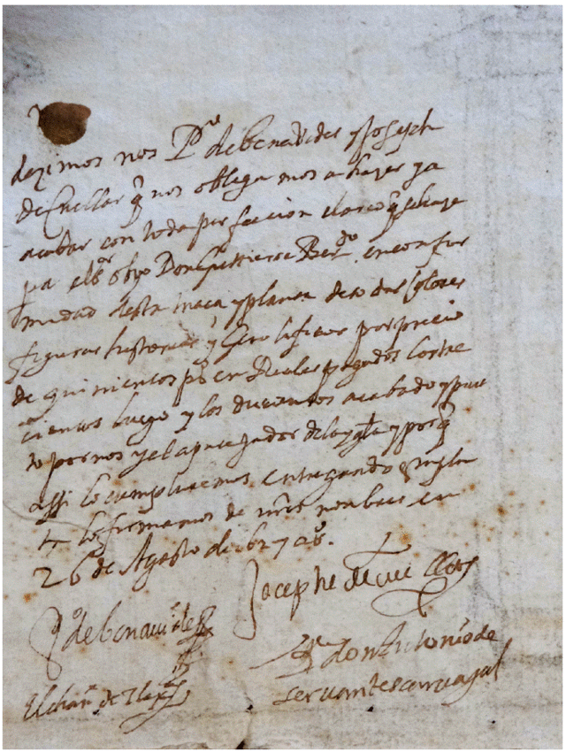Decimos nos, Pedro de Benavides y Joseph de Cuéllar, que nos obligamos a hacer y a acabar con toda perfección el arco que se hace para el señor obispo don Gutierre Bernardo en conformidad de esta traza y planta de todos colores, figuras, historias y jeroglíficos10 por precio de quinientos pesos en reales, pagados los trecientos luego y los doscientos acabado y puesto por nos y el aparejador de la iglesia; y por que así lo cumpliremos entregando esta pla[n]ta los firmamos de nuestros nombres en 26 de agosto de 1627 años.