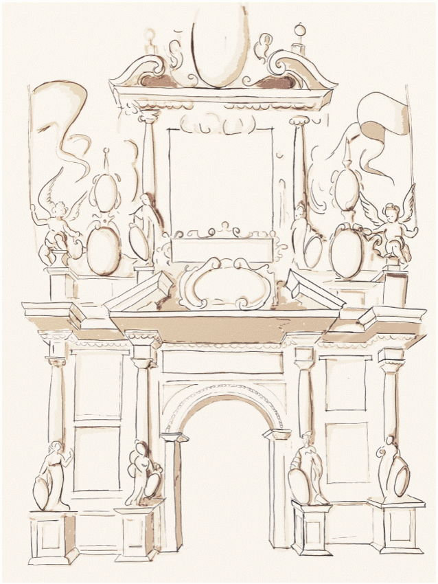 A partir de esos ejes y referencias el pintor continuó desarrollando el dibujo sin desatender la correspondencia de proporciones y juegos de líneas. Elaboró primero lo estructural de la arquitectura para lo que, haciéndose eco del sentido principal de la obra, debió tomar como referente en el trazado del cuerpo inferior los arcos triunfales por antonomasia: Roma quanta fuit ipsa ruina docet (Sebastián Serlio).19 En efecto, como es habitual para estos tipos de portadas simbólicas y conmemorativas, es plausible plantear la dependencia del proyecto angelopolitano con los famosos arcos de Tito y de Constantino.