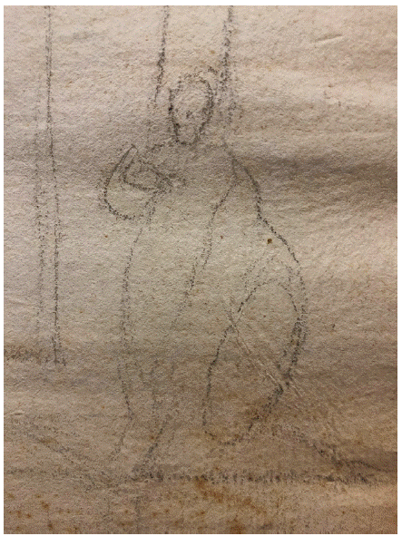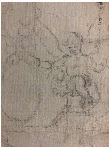 En la ejecución de los elementos descritos vuelven a hacerse presentes las mismas fórmulas de trabajo que en el cuerpo inferior. Se perciben ciertas líneas de guía con regla, así como múltiples orificios de compás para marcar correspondencias. También están los trazados combinados de grafito para hacer las estructuras principales y el trabajo más libre en la ejecución de las efigies portantes de cartelas, éstas con las mismas proporciones que las inferiores y partes ornamentales. En último lugar han de destacarse los aludidos ángeles infantiles que parecen estar casi desnudos, sólo con pequeños paños de pudor, ambos en una proporción mayor que el resto de las figuras. Sostienen con una mano la parte superior de las cartelas que se apoyan en suaves salientes dispuestos en la cornisa, lo que haría que las mismas quedaran con la inclinación o efecto para la correcta percepción de su contenido por parte del espectador desde un punto inferior. En las otras manos sujetan largas astas de amplios banderines con caprichosas ondulaciones que concluyen en dos puntas. Sin duda, su tamaño y protagonismo deben relacionarse con aquello que quedara pintado en las mismas, pero también, con el enmarcado de otras cartelas similares a las inferiores que se proyectan detrás para llenar los espacios y equilibrar las necesarias líneas compositivas oblicuas que van desde los extremos a la cartela que funge de coronamiento. En este punto, he de destacar el trabajo de los ángeles y las enseñas, ya que en ambos conjuntos el artífice se soltó al dibujarlos, combinando diferentes líneas y la inclinación del grafito allá donde lo requiere para dar volumen y mayor resolución a las figuras (Fig. 6).